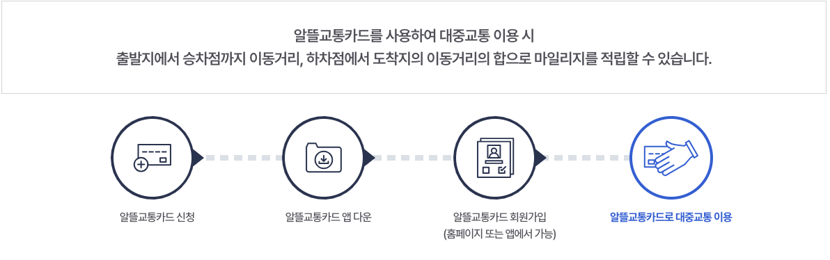 알뜰교통카드를 사용하여 대중교통을 이용하시면 출발지에서 승차점까지 이동거리, 하차점에서 도착지의 이동거리의 합으로 마일리지 적립할 수 있습니다. 이동 거리 합계가 최대 800M까지 적립에 반영됩니다.