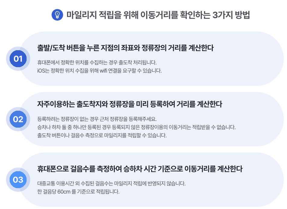 우선 어플에서 출발 / 도착 버튼을 누른 지점의 좌표와 정류장의 거리를 계산하고, 자주 이용하는 출발지, 도착지와 정류장을 미리 등록하여 거리를 계산합니다. 이때 승차, 하차 역 중 하나만 등록하시면 등록하지 않은 정류장의 이동 거리는 적립받을 수 없다는 점 유의하셔야겠습니다. 또 승차,하차 역(정류장)과 출발지, 도착지 사이 도보 이동 거리는 휴대폰으로 걸음수 측정하여 승하차 시간 기준으로 이동거리 계산하여 반영합니다.(출퇴근 시간 이외에 걸음은 반영되지 않습니다.)