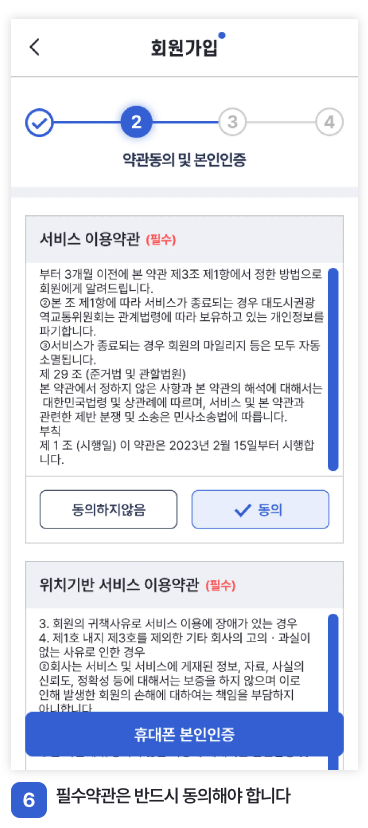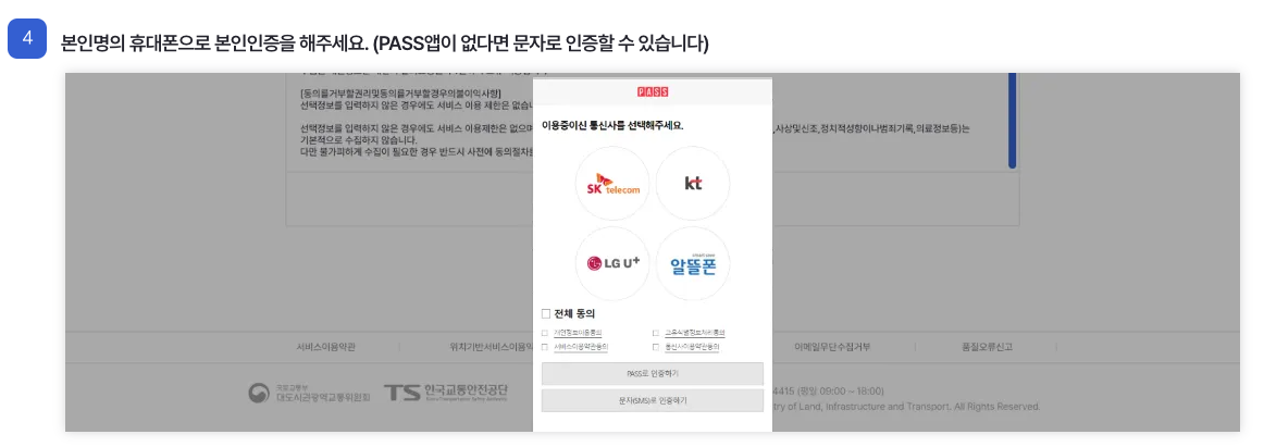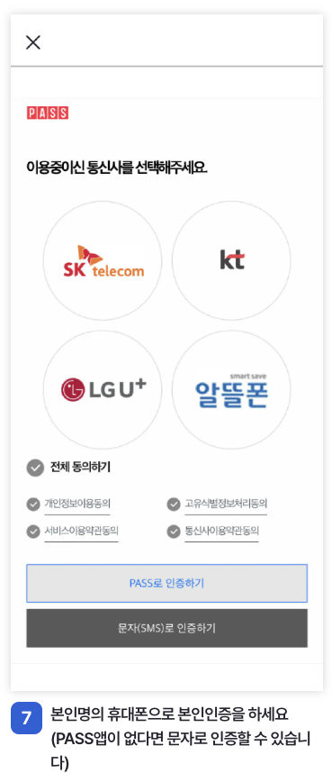 준비물을 확인하셨으면 다음 과정을 진행해줍니다. 카드 번호 입력 후 약관동의 및 본인인증을 해주시면 됩니다.
