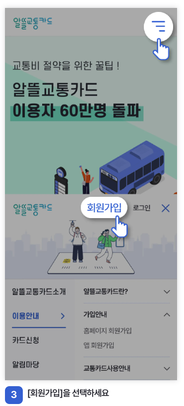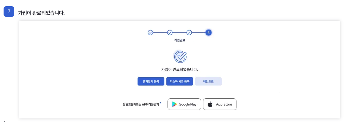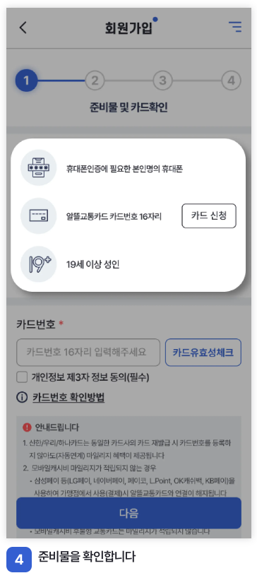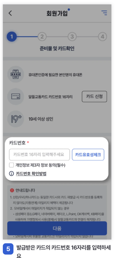 어플로 회원가입 하시는 경우도 위와 비슷합니다. 회원가입 전에 알뜰교통카드로 쓰실 카드 발급 받으시는 것 잊지 마셔야 합니다.