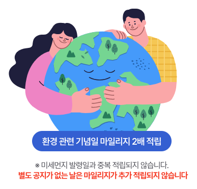 환경 관련 기념일에도 마일리지 2배 적립 혜택이 있는데 별도 공지가 있는 경우에 해당하며 미세먼지 발령일과 중복 적립되지는 않습니다.
