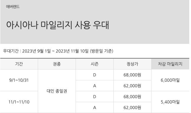 아시아나는 9월에서 10월까지는 6,000마일, 11/1~11/10일까지는 54,000 마일을 차감하면 대인 종일권 이용 가능합니다.