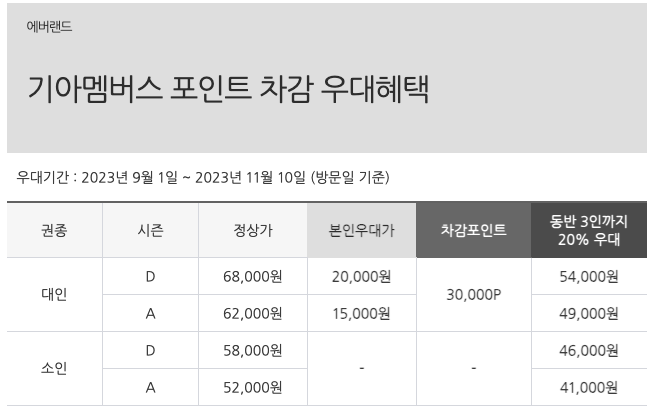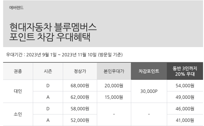 멤버십 회원 본인 40% 할인된 가격으로  대인 기준 A 시즌에 37,200 / D 시즌에는 40,800원에 이용하실 수 있습니다. 또 동반 3인까지는 20% 할인 받을 수 있습니다. (A : 49,600 원/ D 54,400 원)