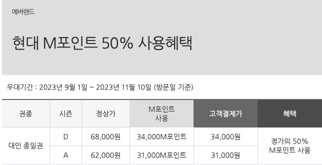 현대카드 M카드 쓰시는 분들은 에버랜드 자유이용권 정가에 50%를 M포인트로 결제하실 수 있습니다.