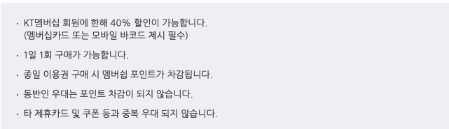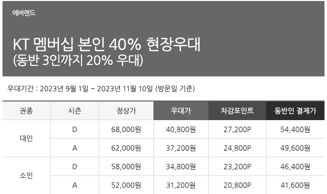 우선 통신사 할인으로는 KT멤버십 등급 상관 없이 40% 현장 우대가 있습니다.
