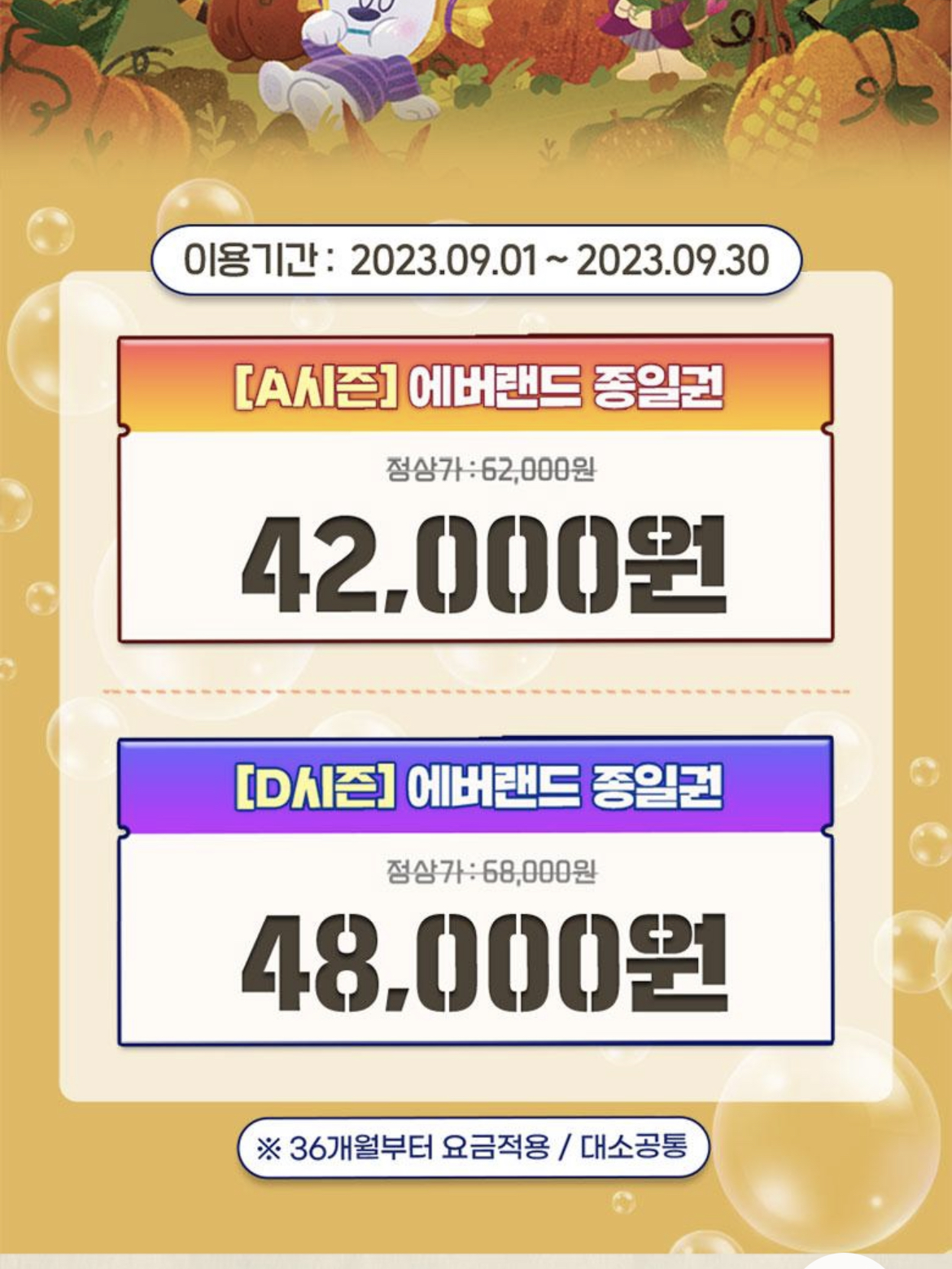 대인 가격으로만 해서 D시즌 34,000원에, A시즌을 31,000원에 이용하실 수 있습니다.