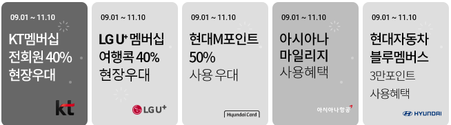 그 밖에 아시아나 마일리지, 현대 블루멤버스 포인트 차감, 기아멤버스 포인트 차감 방식으로도 할인 혜택 받을 수 있습니다.