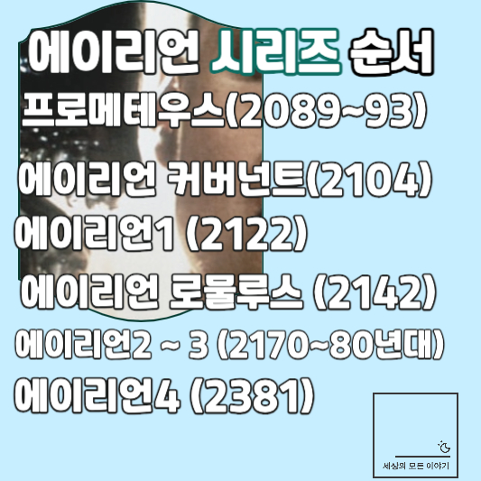 에이리언 로물루스를 보았습니다. 어릴 때부터 사랑하던 시리즈의 매력을 다시 느낄 수 있어 좋았습니다. 근데 보면서 계속 궁금했습니다. 지금 영화 속 시대가 전체 시리즈 중 어느 때쯤인지, 그래서 이번 포스팅에서는 에이리언 시리즈 순서 및 에이리언 알고 보면 좋은 것 몇 가지 정리해 볼까 합니다. 간단하게 읽어 보시고 에이리언 시리즈 즐기시기 바랍니다.