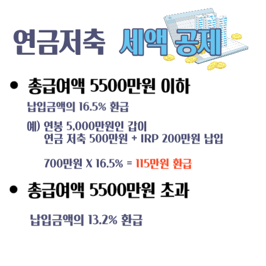 정부에서는 사적연금을 가입을 권장하기 위해 연금계좌가 있는 경우 세액 공제 혜택을 주고 있습니다. 연금으로 납입한 금액의 일부를 세금에서 줄여주는 건데요, 총급여가 5500만원 이하면 납입금의 16.5%를 5500만원 이상이면 13.2%를 환급받을 수 있습니다.