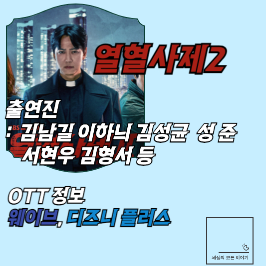 2019년을 강타했던 코믹 액션 드라마 열혈사제가 5년만에 시즌2로 돌아왔습니다. 이번 포스팅에서는 열혈사제2 출연진 등장인물 열혈사제2 볼 수 있는 OTT 정보까지 정리해 드리겠습니다.