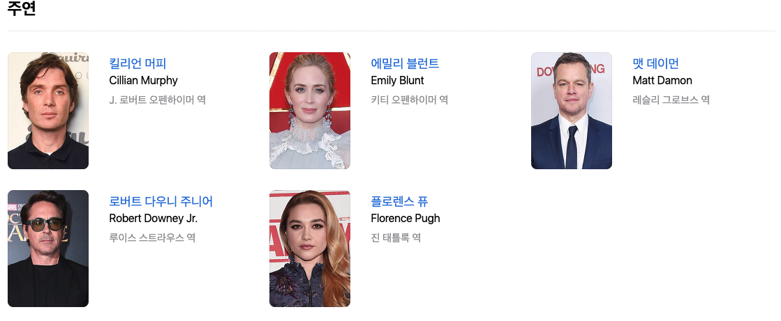 다음은 오펜하이머 주요 출연진 정보입니다.