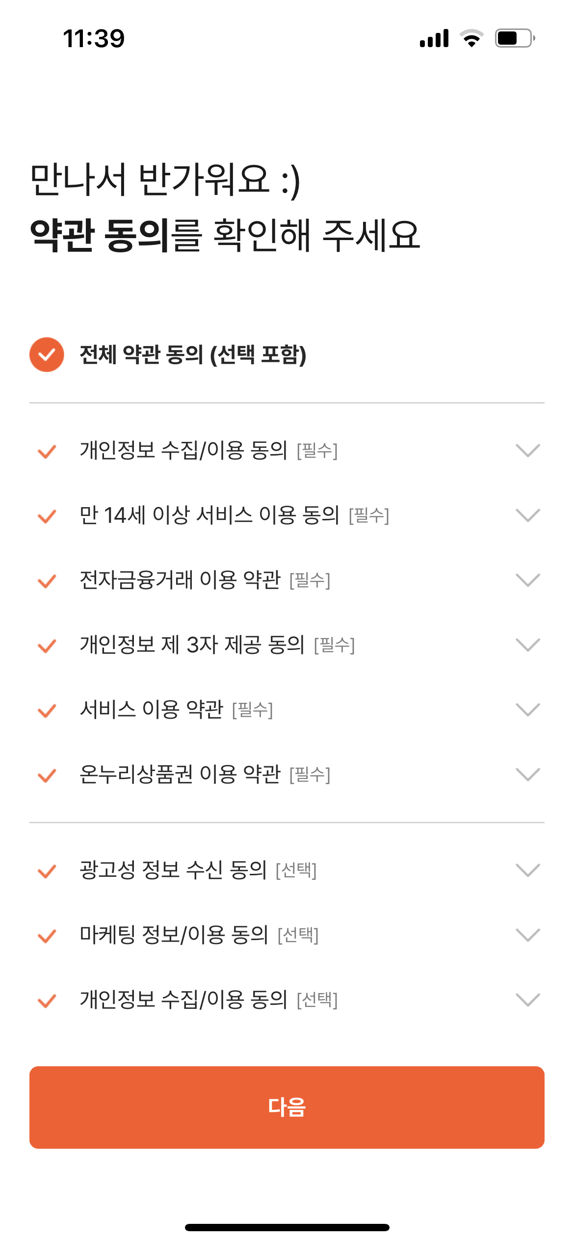어플 설치 후 실행하면 환영의 메시지가 뜹니다. 그 뒤로 어플 이용을 위해 필요한 권한이 나오고 이를 확인한 뒤 약관에 동의해주시면 됩니다.
