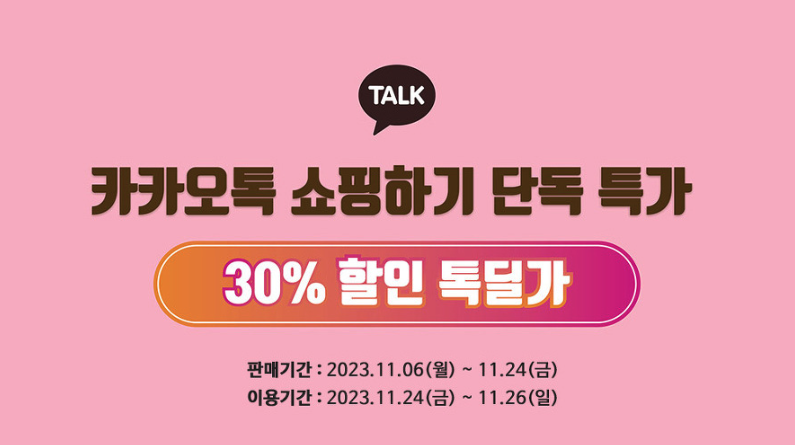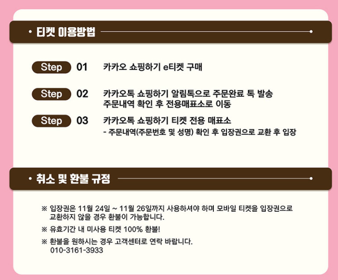 11월 6일(월) ~ 11월 24일(금)까지 카카오 쇼핑하기를 이용 e티켓을 30% 할인 받아 구매하신 후 카톡으로 수신하신 주문 완료 톡 확인 후 행사장에서 카카오톡 쇼핑하기 전용 매표소를 이용 입장권으로 교환 후 입장하시면 됩니다. 티켓은 축제 기간 동안(11월 24일 ~ 26일) 이용하실 수 있습니다.