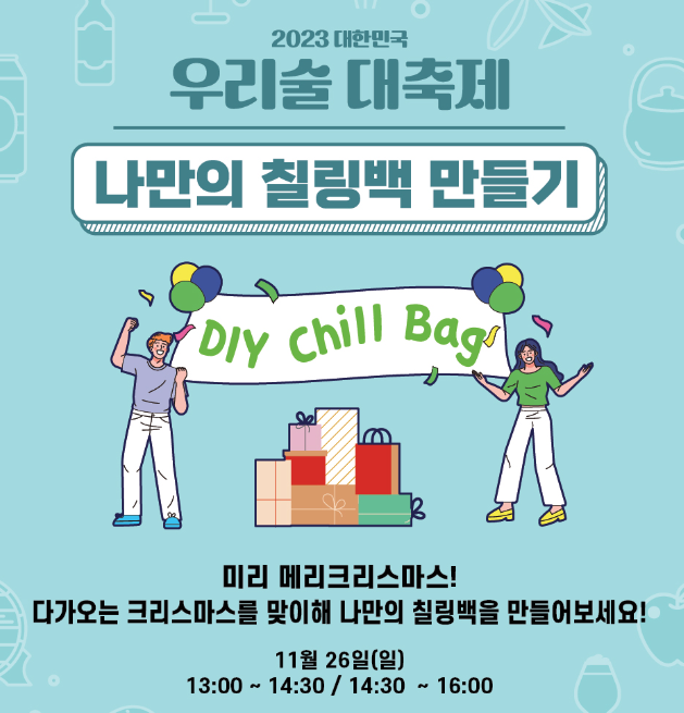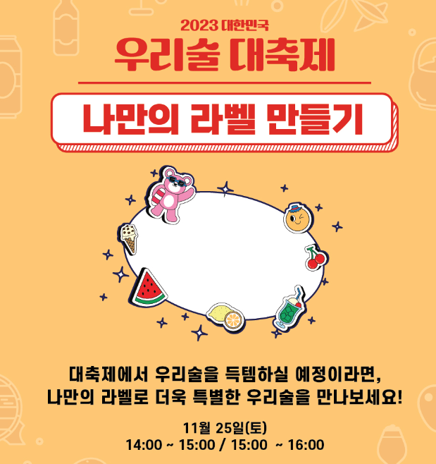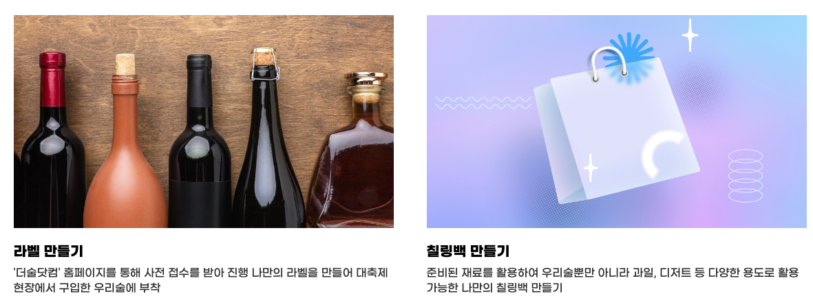 부대행사에서는 사전 신청을 통해 우리술 만들기나 나만의 라벨 만들기, 나만의 칠링백 만들기 등을 직접 해보실 수 있습니다.