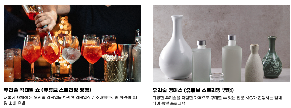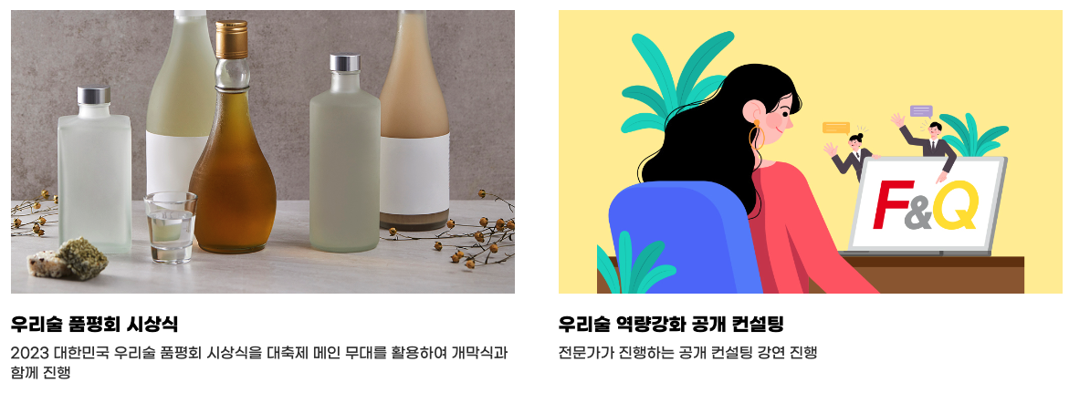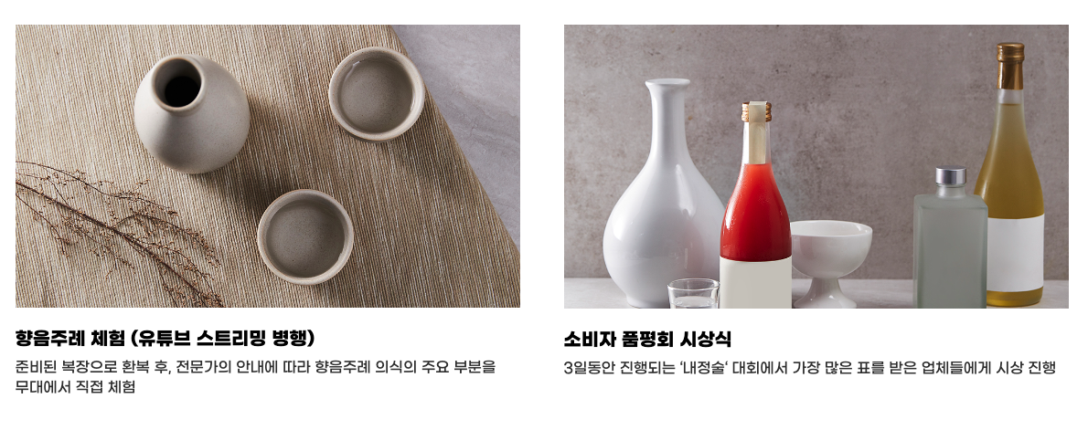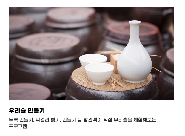 전국의 다양한 우리술을 한 자리에서 만날 수 있으며 다양한 소비자 체험 프로그램도 경험할 수 있어 술을 좋아하시고 전통주에 관심이 많은 분들은 한번쯤 가보셔도 좋을 듯합니다.