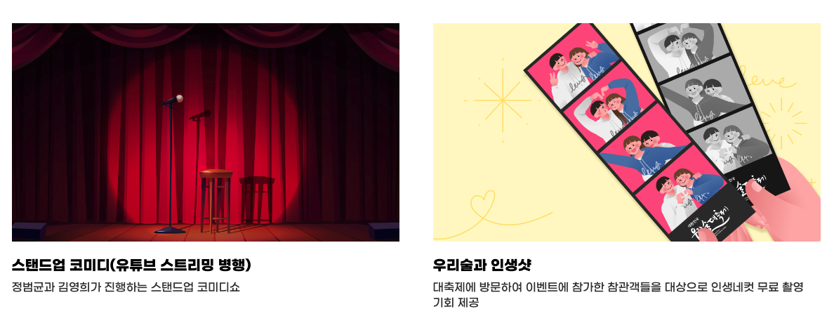 우리술 대축제는 무대프로그램과 부대행사로 나눠 진행됩니다. 무대에서는 24(일) 14:00 개막식 및 우리술 품평회 시상식으로 축제를 시작해서 우리술 경매쇼, 향음주례 체험, 스탠드업 코미디 등이 이어질 예정입니다.