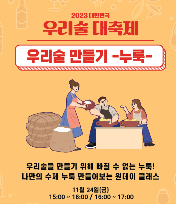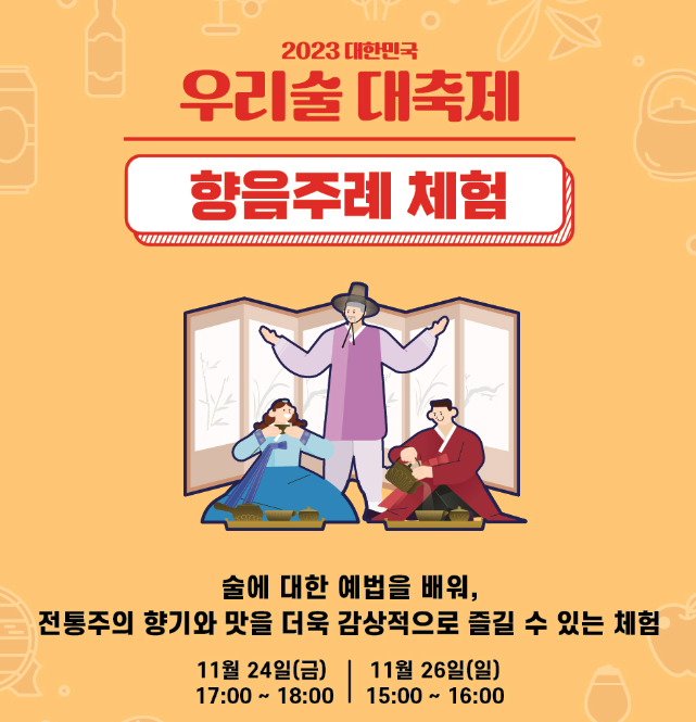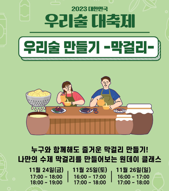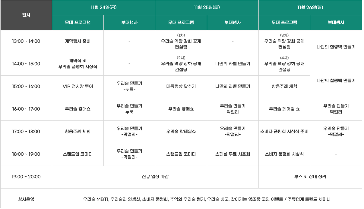 2023 우리술 대축제의 일정은 11월 24일(금)부터 ~ 11월 26일(일)까지 입니다.