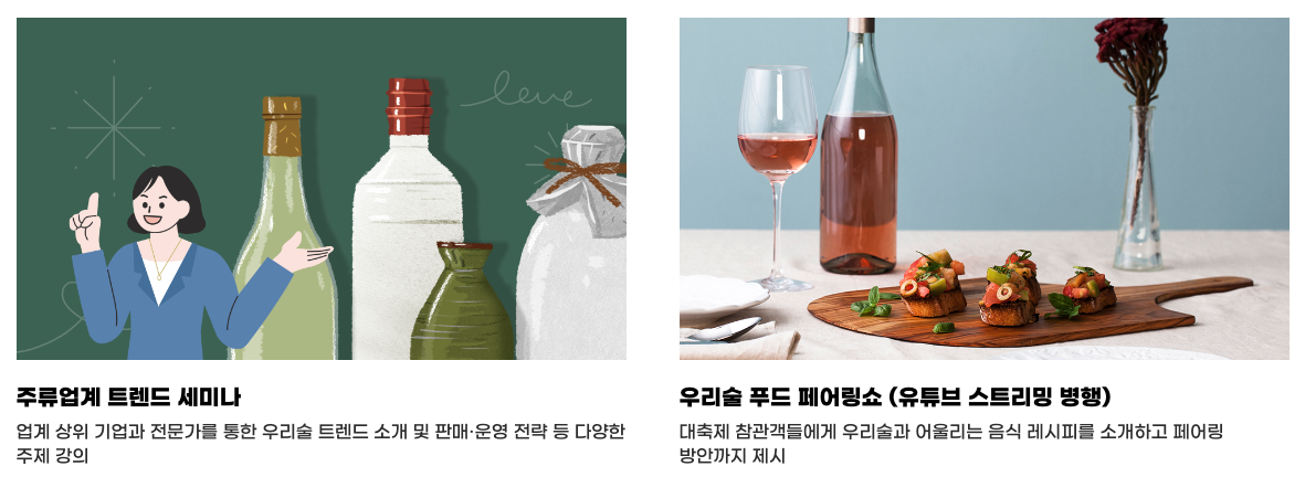 우리술 대축제는 농림축산식품부가 주최하고 한국농수산식품유통공사 주관하는 행사로 우리술의 가치와 우수성을 알리기 위해 2016년부터 시작된 국내 최대 전통주 행사입니다.