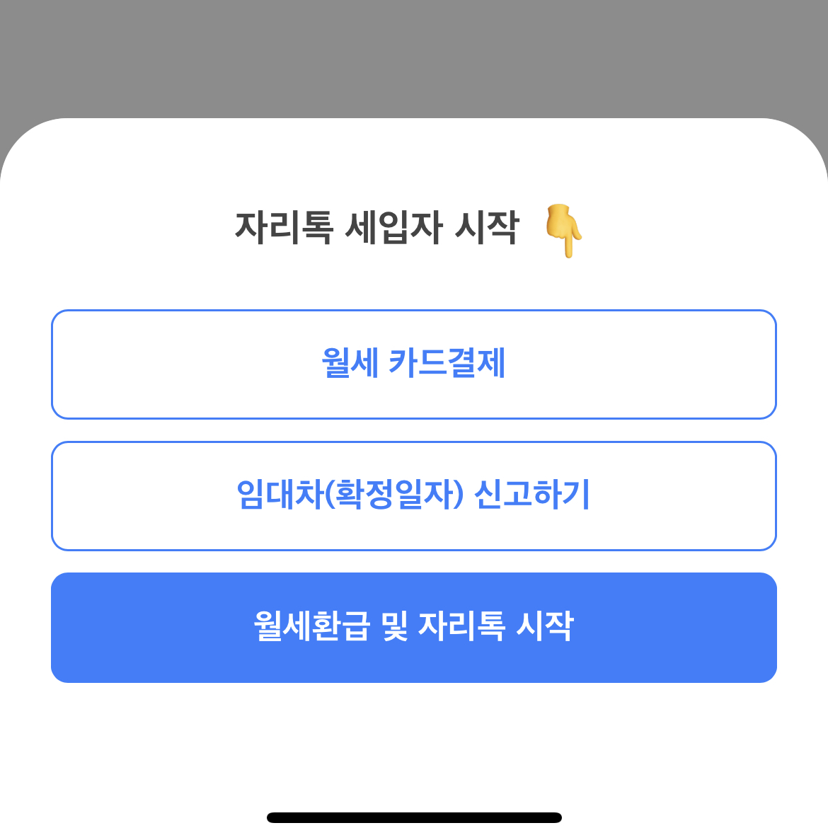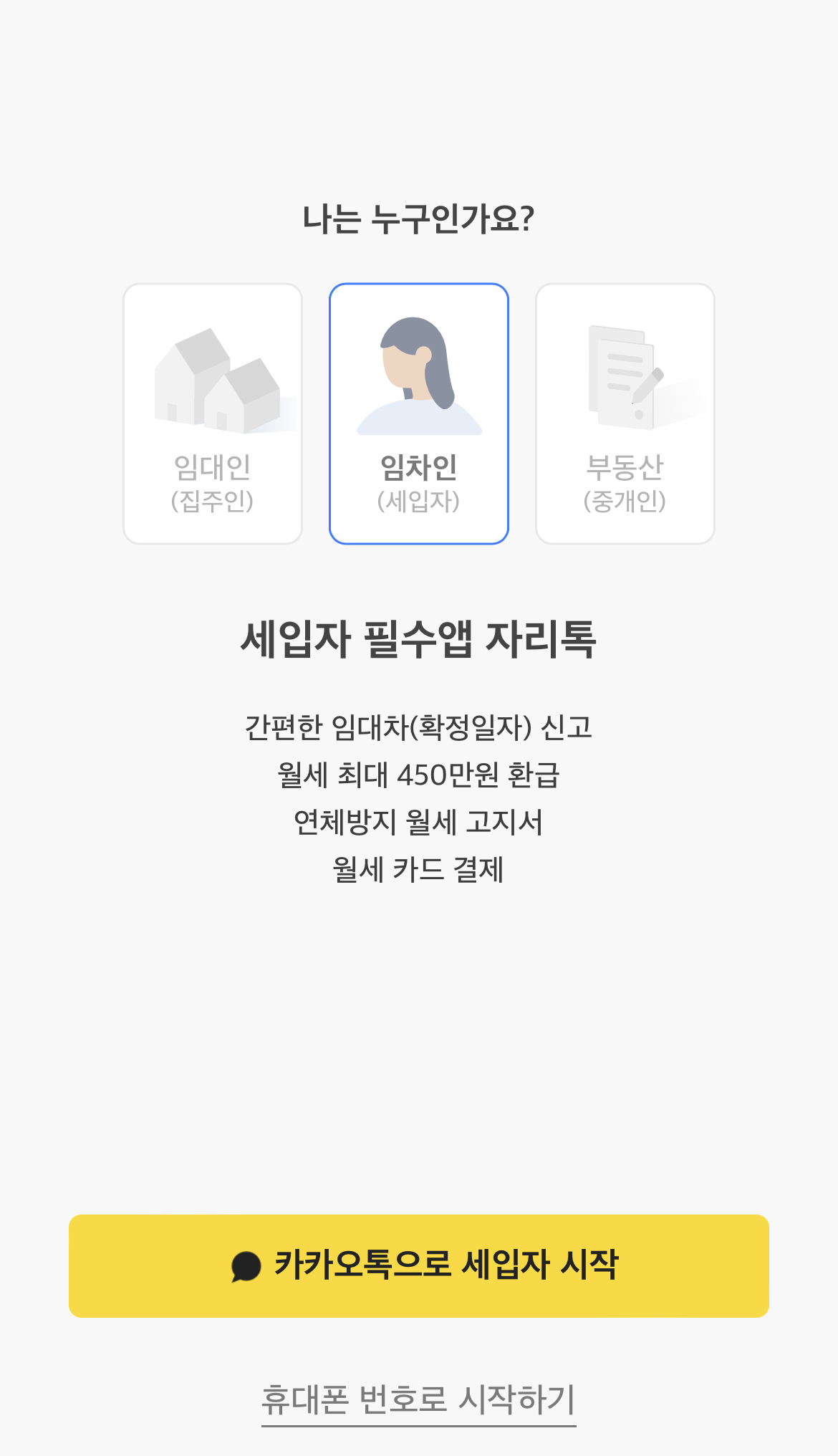 자리톡을 설치하여 세입자를 선택, 카카오톡 로그인 후 현재 주거 형태 관련 정보를 입력하면 바로 시작할 수 있습니다.