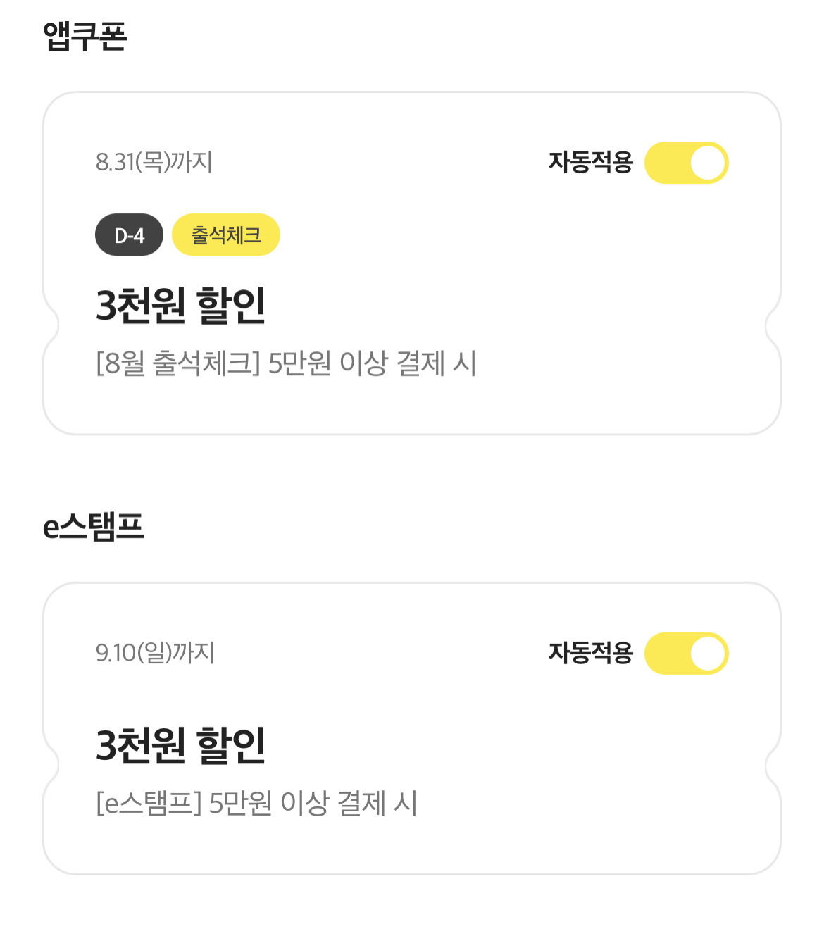 또 모든 쿠폰은 어플에서 자동 적용 설정을 해두시면 계산할 때 따로 확인받을 필요 없이 할인 받을 수 있다는 점 잊지 마시기 바랍니다.