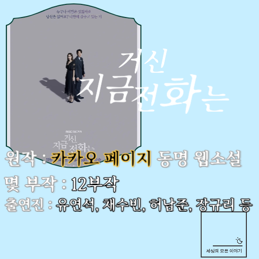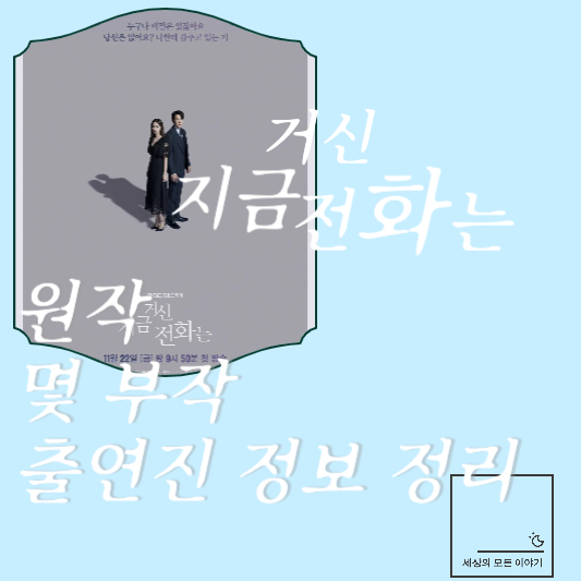 11월 22일부터 매주 금토 밤 9시 50분에 MBC에서 방영될 '지금 거신 전화는'은 웹소설 작가 '건어물녀'님이 카카오 페이지에서 연재한 동명의 로맨스 웹소설을 원작으로 하고 있습니다. 웹소설은 이미 완결된 작품이니 궁금하신 분은 웹소설을 먼저 보셔도 좋을 듯합니다.