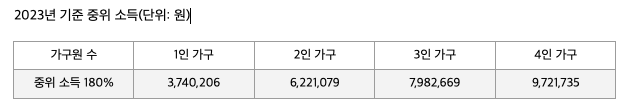 또 한 가지 가입 기준은 가구 소득입니다. 가구 소득 기준은 중위 180%이하로 가구원의 수에 따라 상이합니다. 4인 가족의 경우 월 최대 970만원 정도 소득 이하인 경우 가입이 가능합니다.