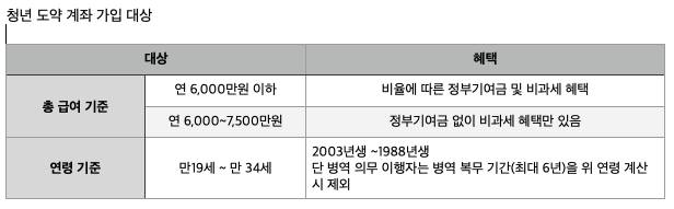 신청 대상 자 중 직전 3개년도 중 1회 이상 금융소득종합과세 대상자는 가입이 제한됩니다. 금융 소득이란 예금 등에 의한 이자 소득이나 주식 등의 배당 소득의 합으로 이 금액이 2,000만원을 초과하는 경우는 청년 도약 계좌에 가입할 수 없습니다.