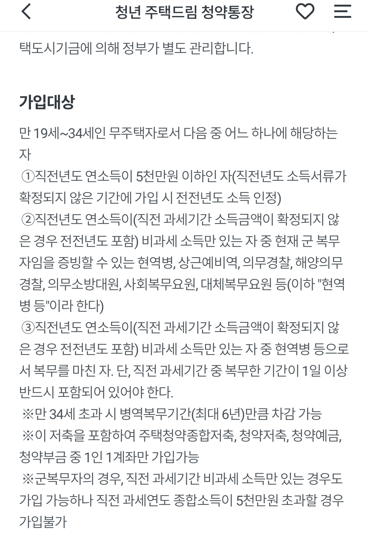단 나이 조건에서 34세를 넘더라도 병역의 의무를 다했다면 병역복무기간(최대 6년) 만큼 차감하여 가입할 수 있습니다.