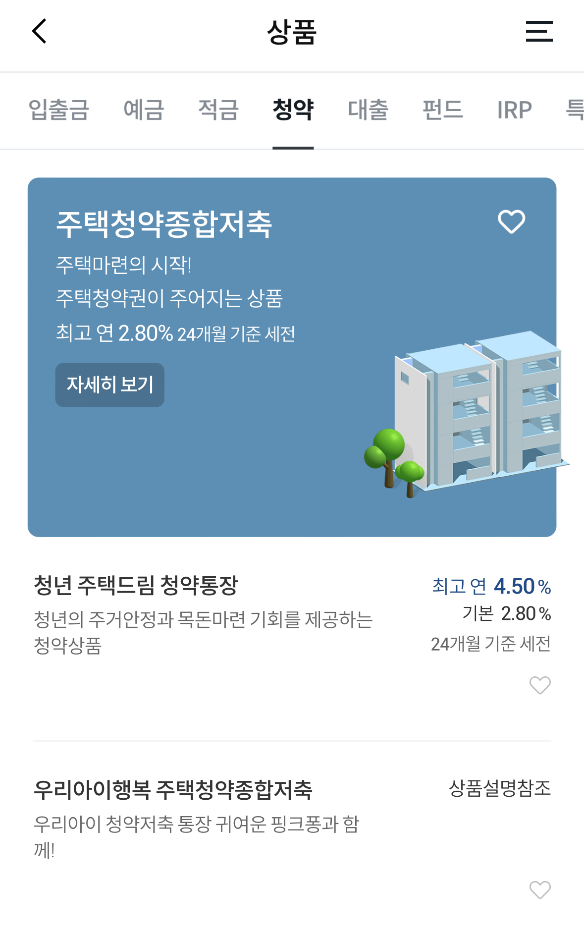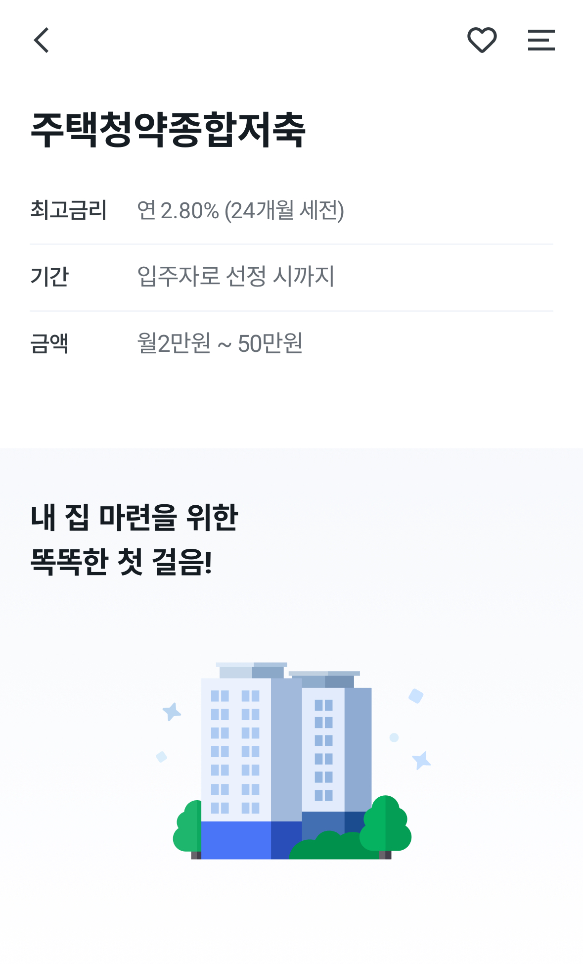 주택청약종합저축이라고 불리는 청약통장은 최고 연 2.80%의 금리가 적용되며 월 납입 최소 금액은 2만원부터 최대 50만원까지 납입할 수 있습니다. (단, 청약 신청 자격을 획득하거나 높은 순위를 받으려면 일정 금액이상 통장에 납입 돼있어야 합니다.) 청약통장은 다른 적금과 달리 만기가 없이 입주자로 선정될 때까지 계좌를 유지하셔야 합니다.