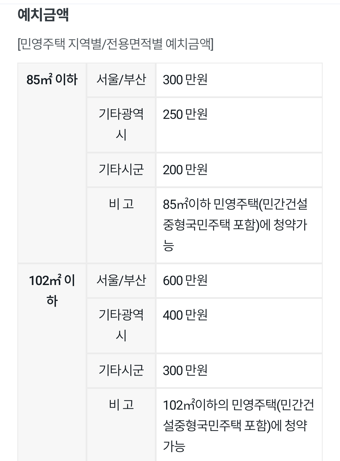 예를 들어 85㎡(약 25평)의 민영주택의 경우 예치금액이 서울은 300만원 기타 광역시는 250만원, 기타 시군은 200만원입니다.