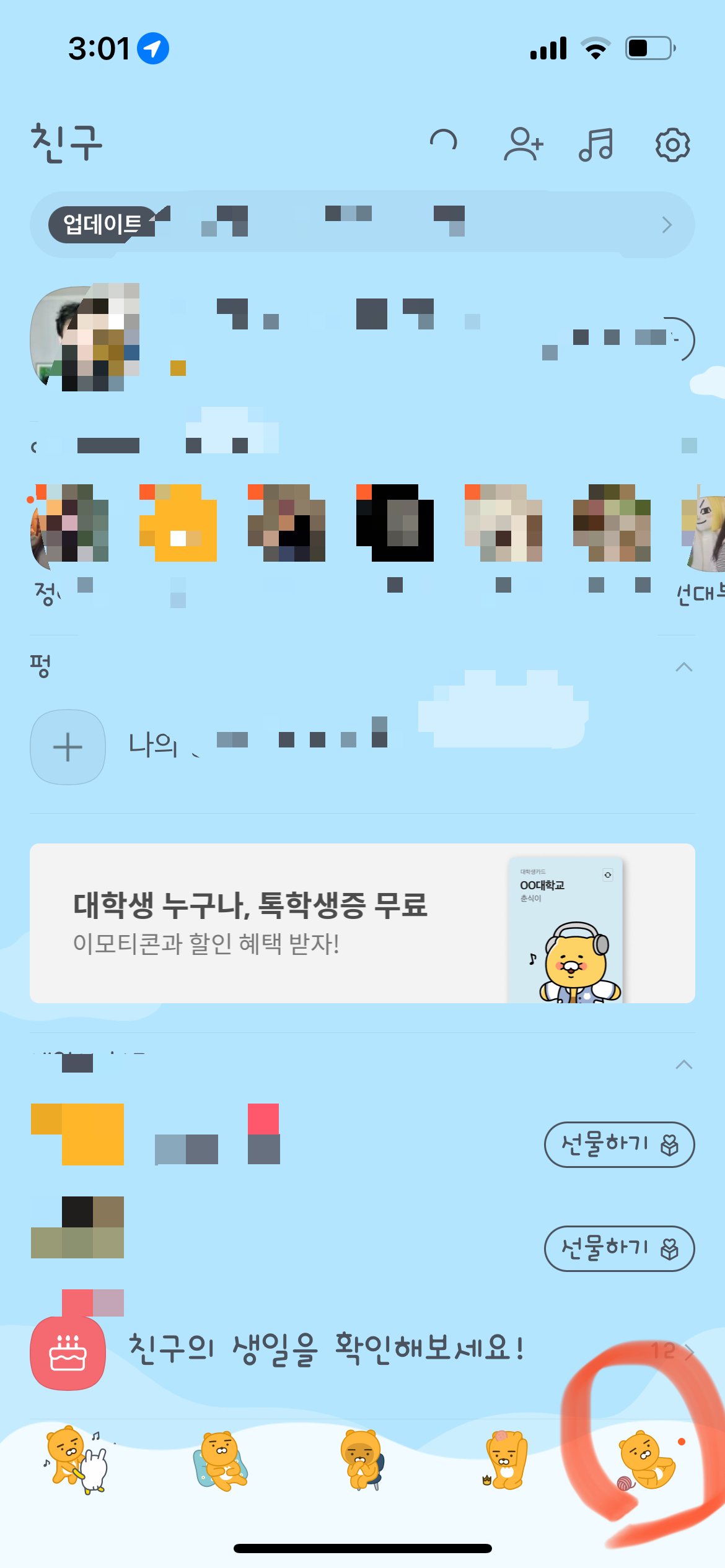 위와 같이 카톡 실행 후 처음 보이는 화면에서 맨 오른쪽 아래 캐릭터(혹은 세줄)을 눌러 줍니다.