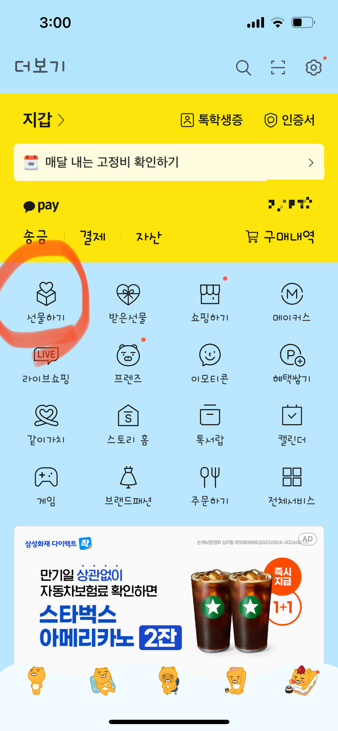 그리고 다음 화면에서 선물하기를 선택합니다. 그럼 선물하기 화면이 보이고 역시 오른쪽 맨 아래에 있는 선물함을 눌러 줍니다.