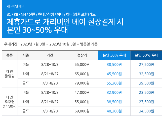 소지하신 카드 중에 하나, 국민, 우리카드가 있으시면 할인된 가격에 캐리비안베이 이용하실 수 있습니다.