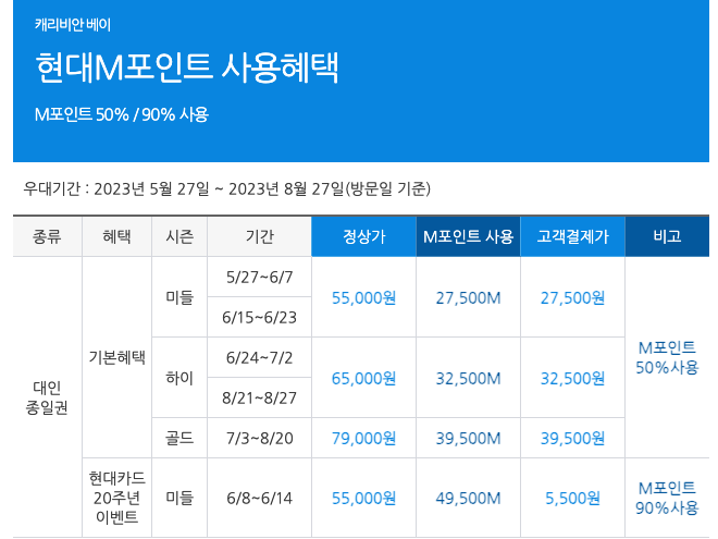 우선 현대카드 쓰시는 분들은 M포인트로 사용해서 캐리비안베이 이용하실 수 있습니다.