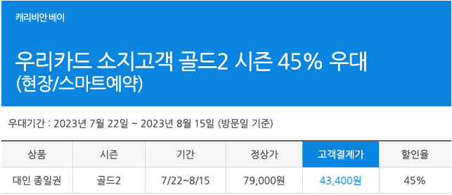 우리카드 역시 소지하고 계신 모든 고객 골드2 시즌 대인 종일권 45% 할인된 가격(43,400)에 구매하실 수 있는 혜택이 있습니다.