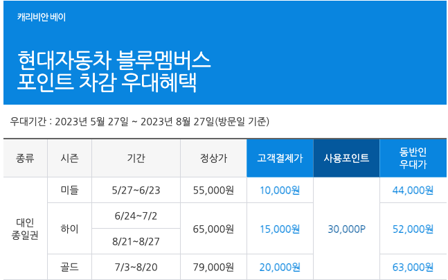현대자동차 블루멤버스, 기아멤버스라면 포인트 차감 방식으로 대인 종일권을 싸게 구매하고 이용하실 수 있습니다.