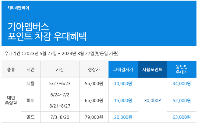 워터파크의 대명사, 캐리비안베이 다들 아시죠? 이런 무더운 날씨에 한번쯤 가보고 싶은데요 그런데 성인 종일권이 성수기(골드시즌)기준 79,000원으로 만만치 않습니다. 이럴 때 필요한 것은 할인 정보입니다. 캐리비안베이 할인 받고 즐기는 법 간단하게 정리해 드릴테니 꼭 확인하고 이용하시기 바랍니다.