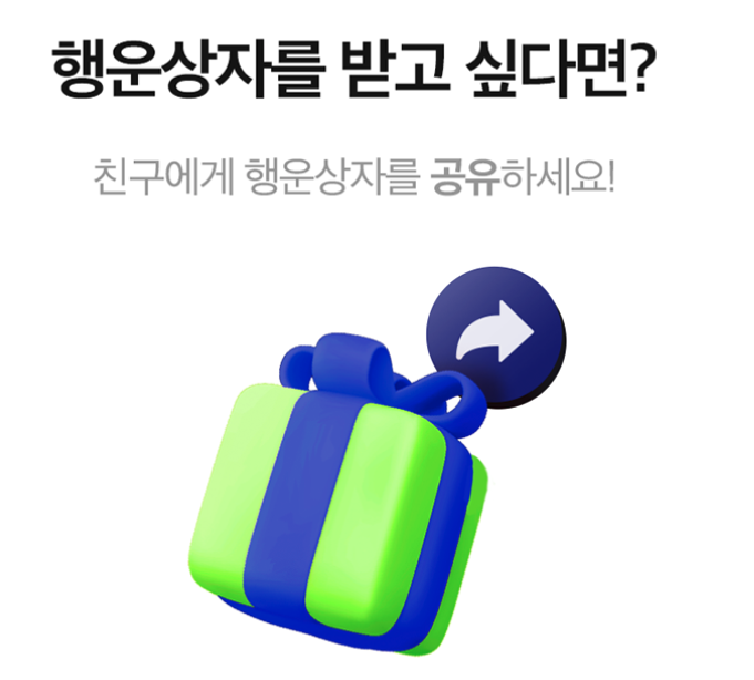 행운상자를 받고 싶다면 우선 친구에게 행운상자를 공유합니다. 케이뱅크 계좌가 있는 친구가 공유한 행운상자를 받으면 보낸 사람과 받는 사람 모두 하나씩 생깁니다. 만약 케이뱅크 계좌가 없는 친구가 상자를 받고 계좌를 개설하면 친구도 나도 각 100개씩 상자를 받을 수 있습니다.