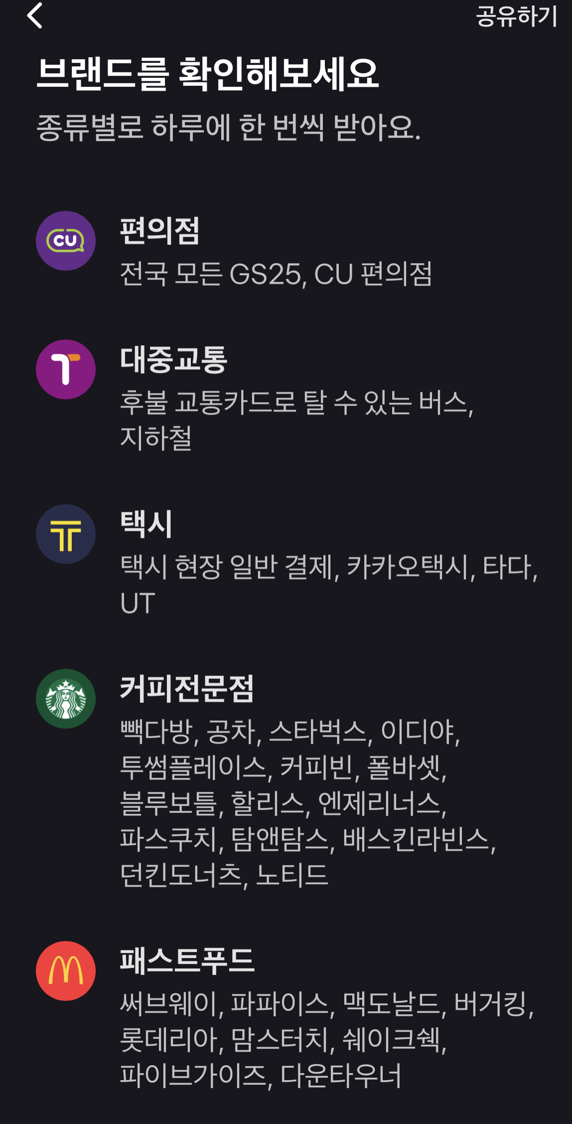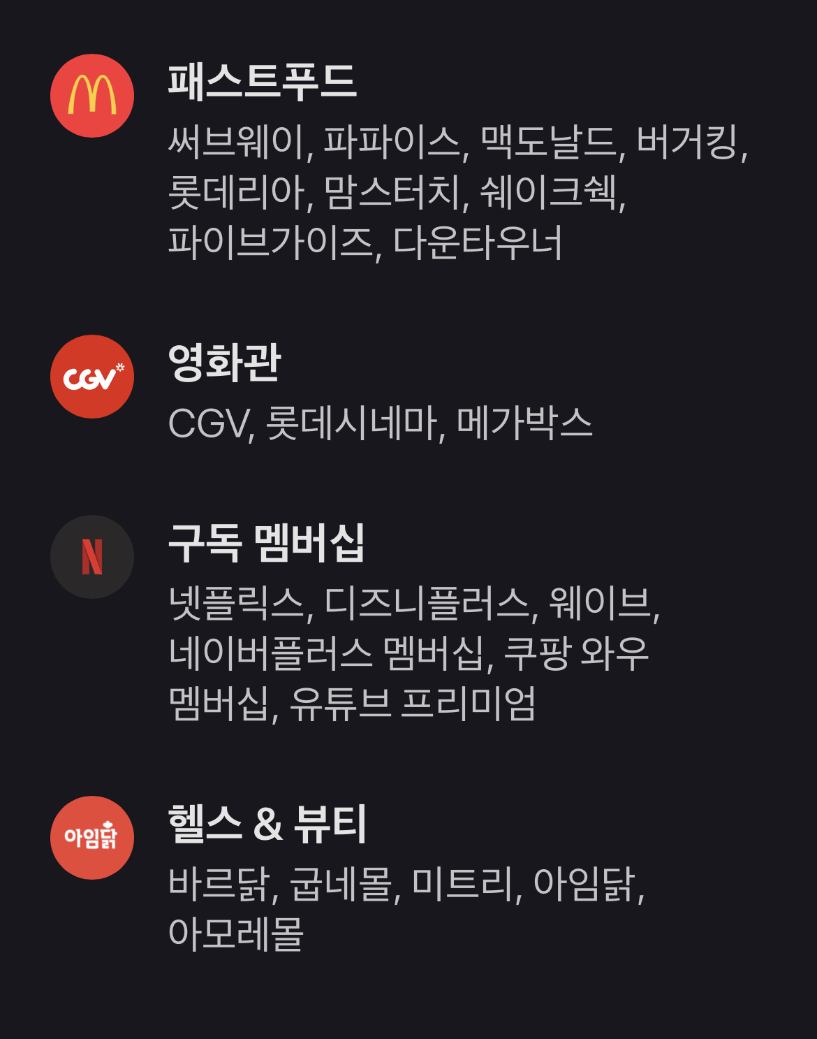 혜택 받을 수 있는 브랜드도 다양합니다. GS25, CU와 같은 편의점부터 빽다방에서 던킨도너츠 스타벅스 등 주요 커피전문점, 맥도날드 써브웨이 맘스터치 등의 패스트 푸드에서도 캐시백 혜택 받을 수 있습니다.