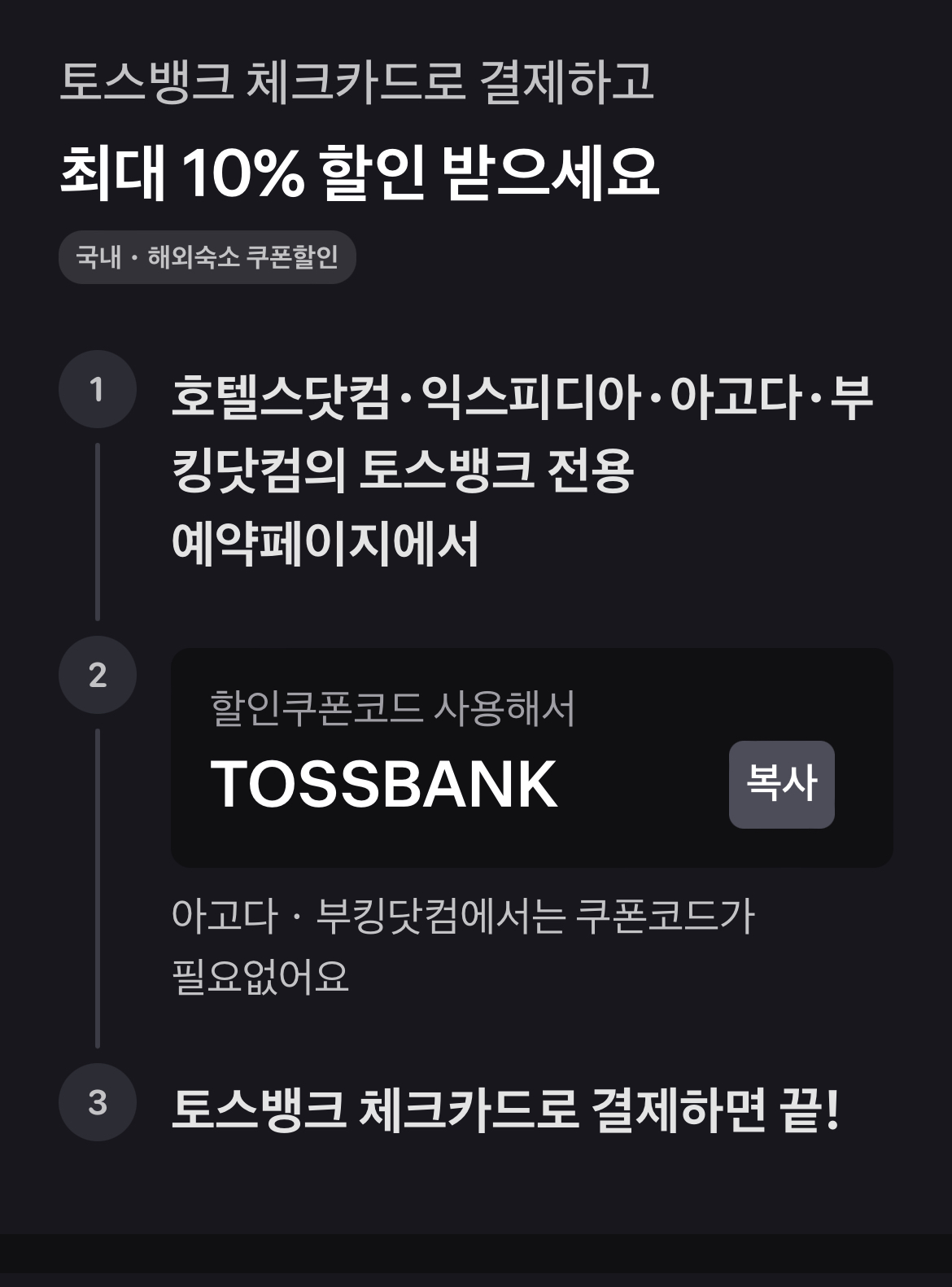 호텔스닷컴, 익스피디아, 아고다, 부킹닷컴의 토스뱅크 전용 예약 페이지에서 토스뱅크 할인쿠폰코드 사용해서(아고다, 부킹닷컴은 쿠폰 코드 없이 가능) 예약 후 토스 체크 카드로 결제하면 됩니다.