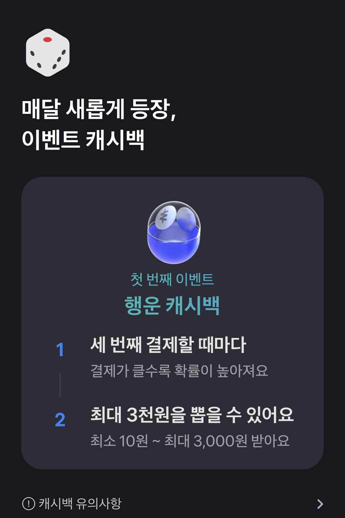 마지막으로 매달 새롭게 제공되는 이벤트 캐시백이 있습니다. 이벤트 캐시백은 매달 새로운 혜택을 제공하는 것인데요 현재 진행 중인 이벤트는 행운 캐시백입니다. 매 세 번째 결제할 때마다 최대 3천원을 돌려 받을 수 있는 캐시백입니다.
