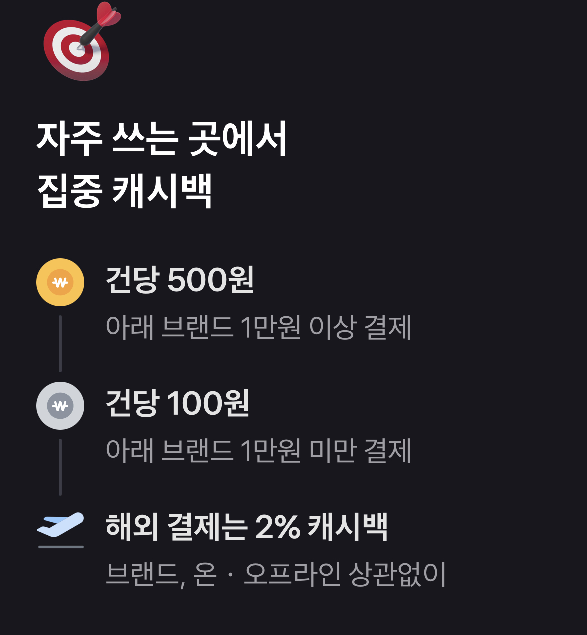 집중 캐시백은 자주 사용하는 곳에서 사용 금액에 따라 캐시백을 받을 수 있습니다.