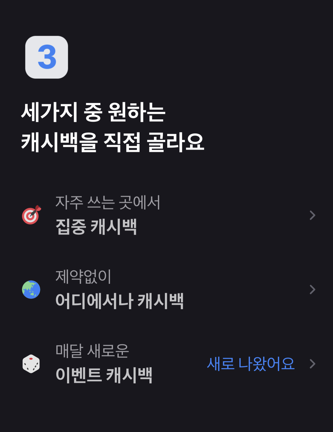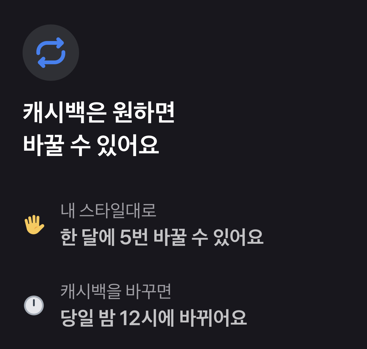 캐시백 혜택은 한 번 선택 후 고정이 아니라 원하면 한 달에 다섯 번까지 바꿀 수 있으니 선택 후 자신과 맞지 않는다고 생각하면 바꾸시면 됩니다.