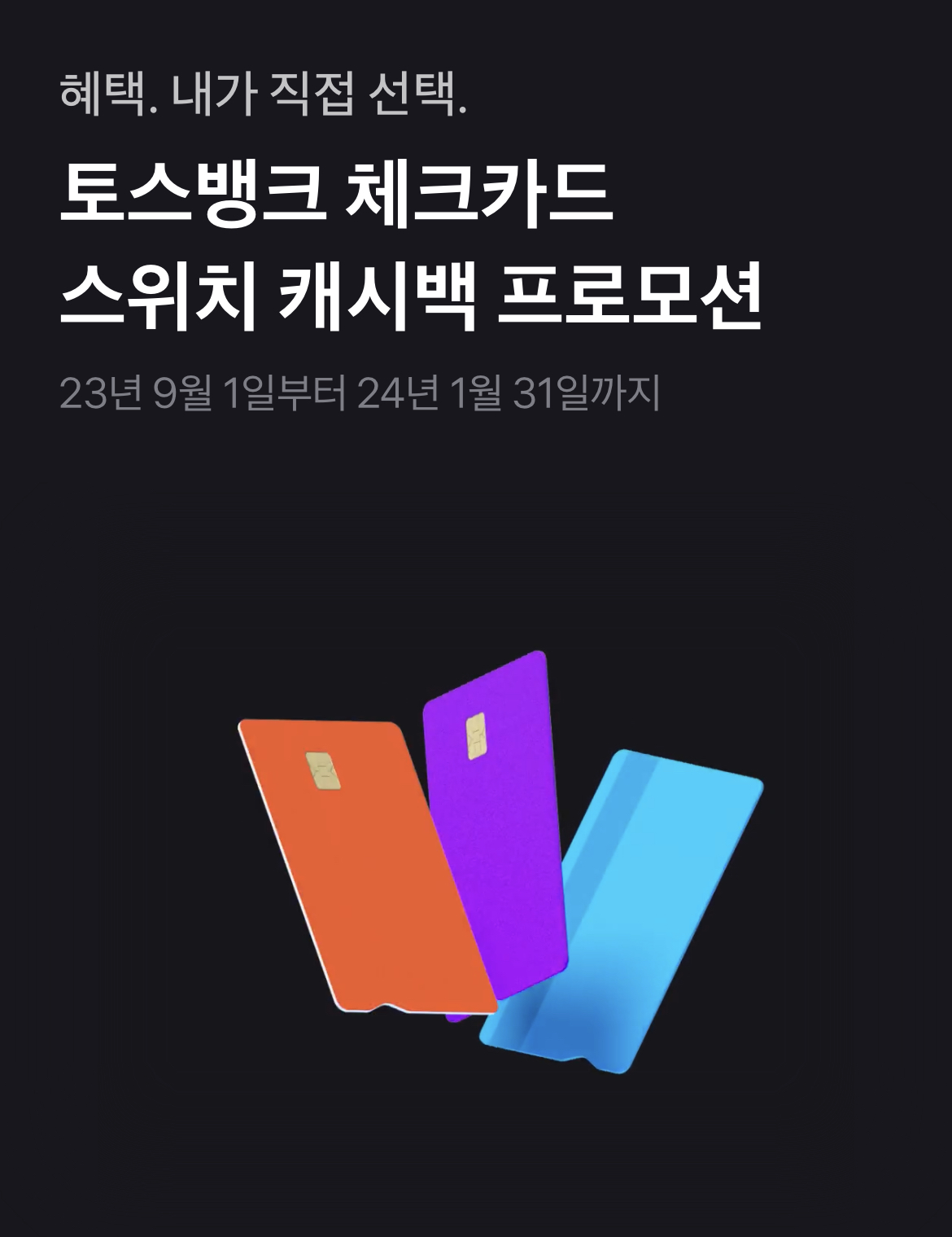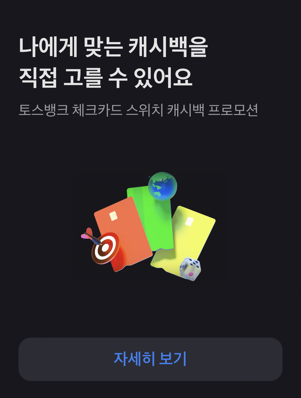 토스 체크 카드 캐시백은 집중 캐시백 / 어디에서나 캐시백 / 이벤트 캐시백 이렇게 세 종류입니다.