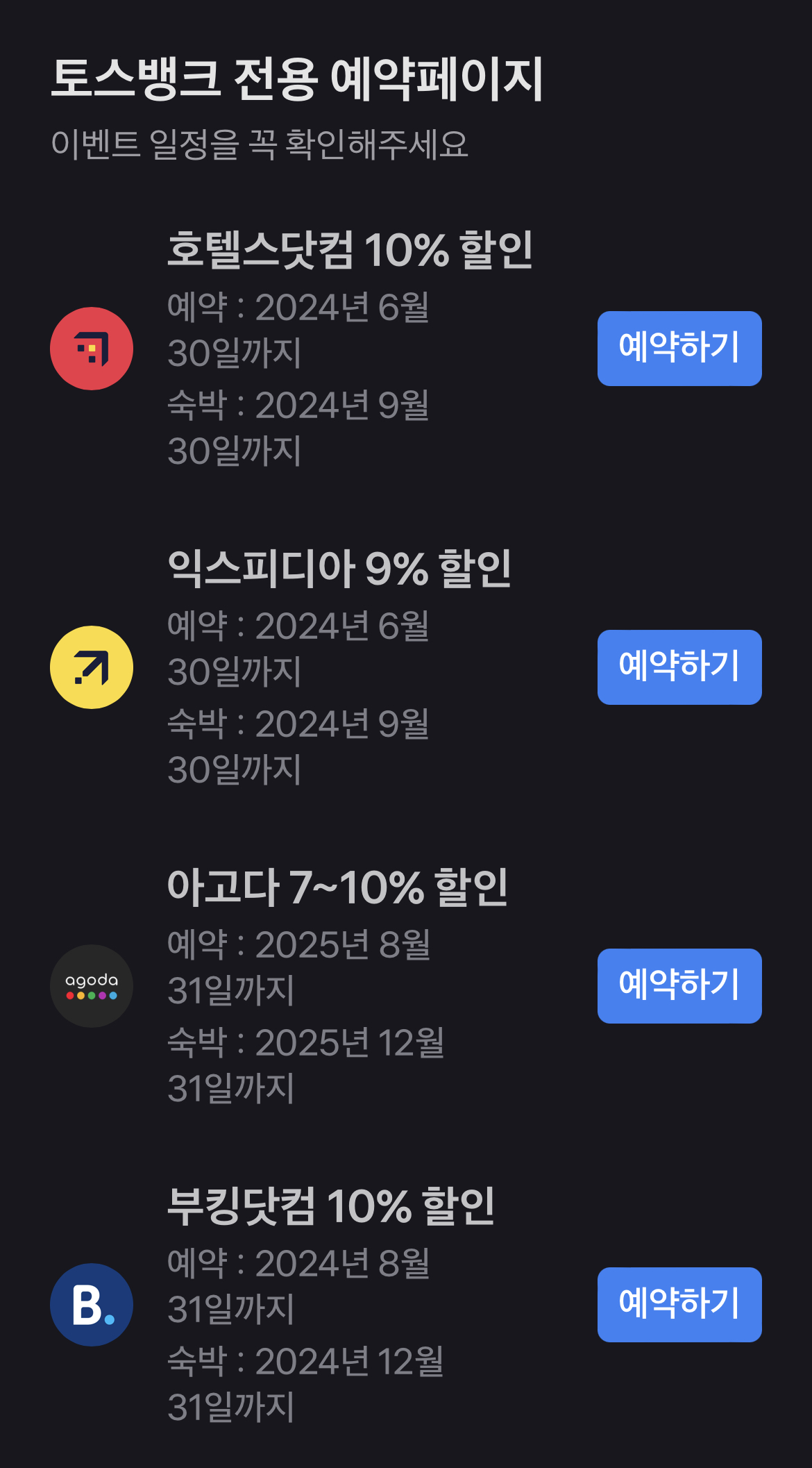 각 플랫폼 마다 최소 7~10%까지 할인 혜택이 있습니다. 다만 예약 가능 기간과 숙박 가능 기간이 정해져 있으니 기간에 유의하셔서 활용하셔야겠습니다.