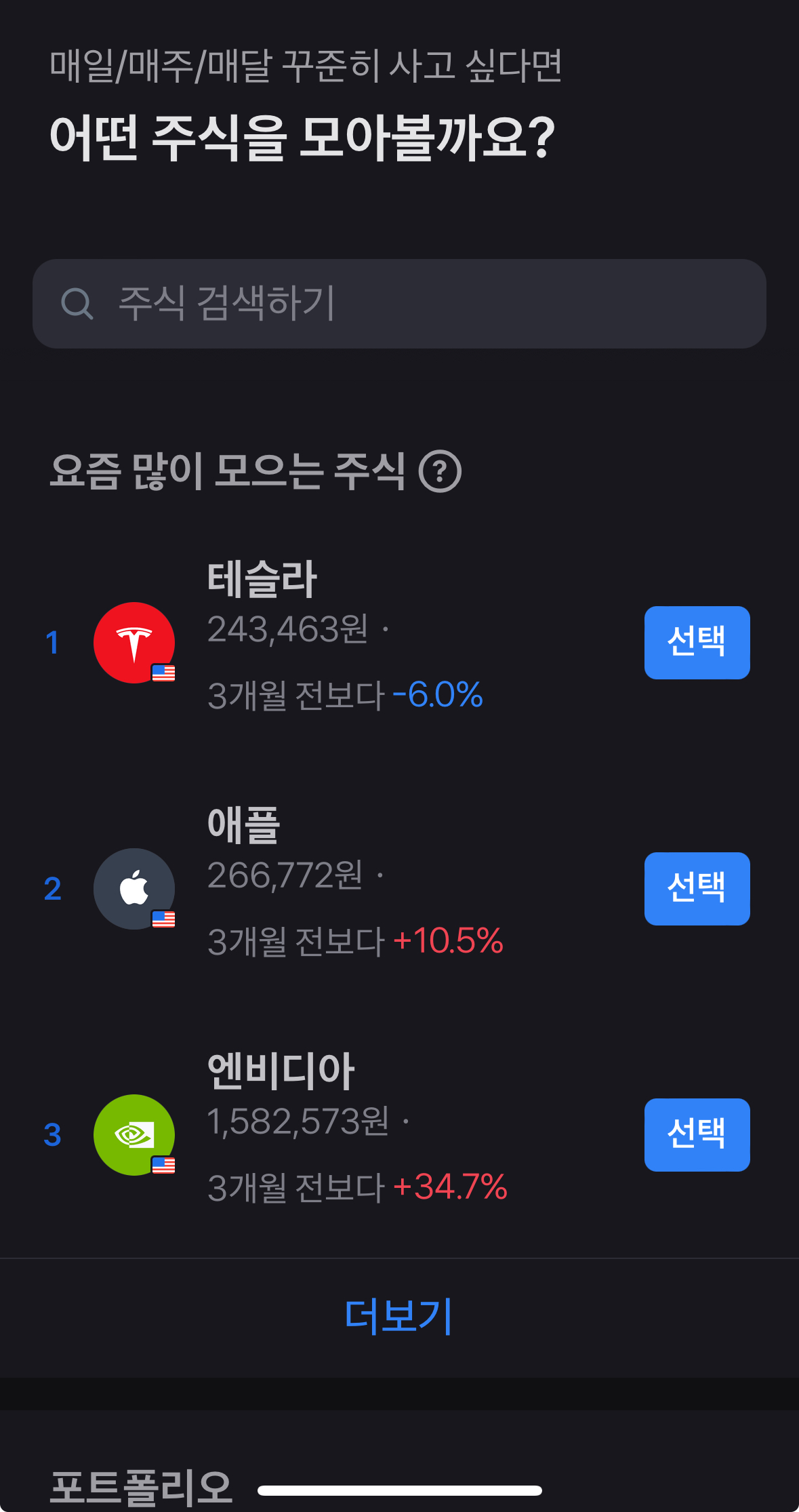 주식 모으기는 한 계좌만 할 수 있는 것이 아니라 상황과 종목에 따라 추가로 모으기 설정하실 수 있습니다. 테슬라, 애플, 엔비디아 같은 단일 종목을 모을 수도 있고 아니면 저처럼 ETF와 같은 포트폴리오 상품을 선택하여 모을 수 있습니다.