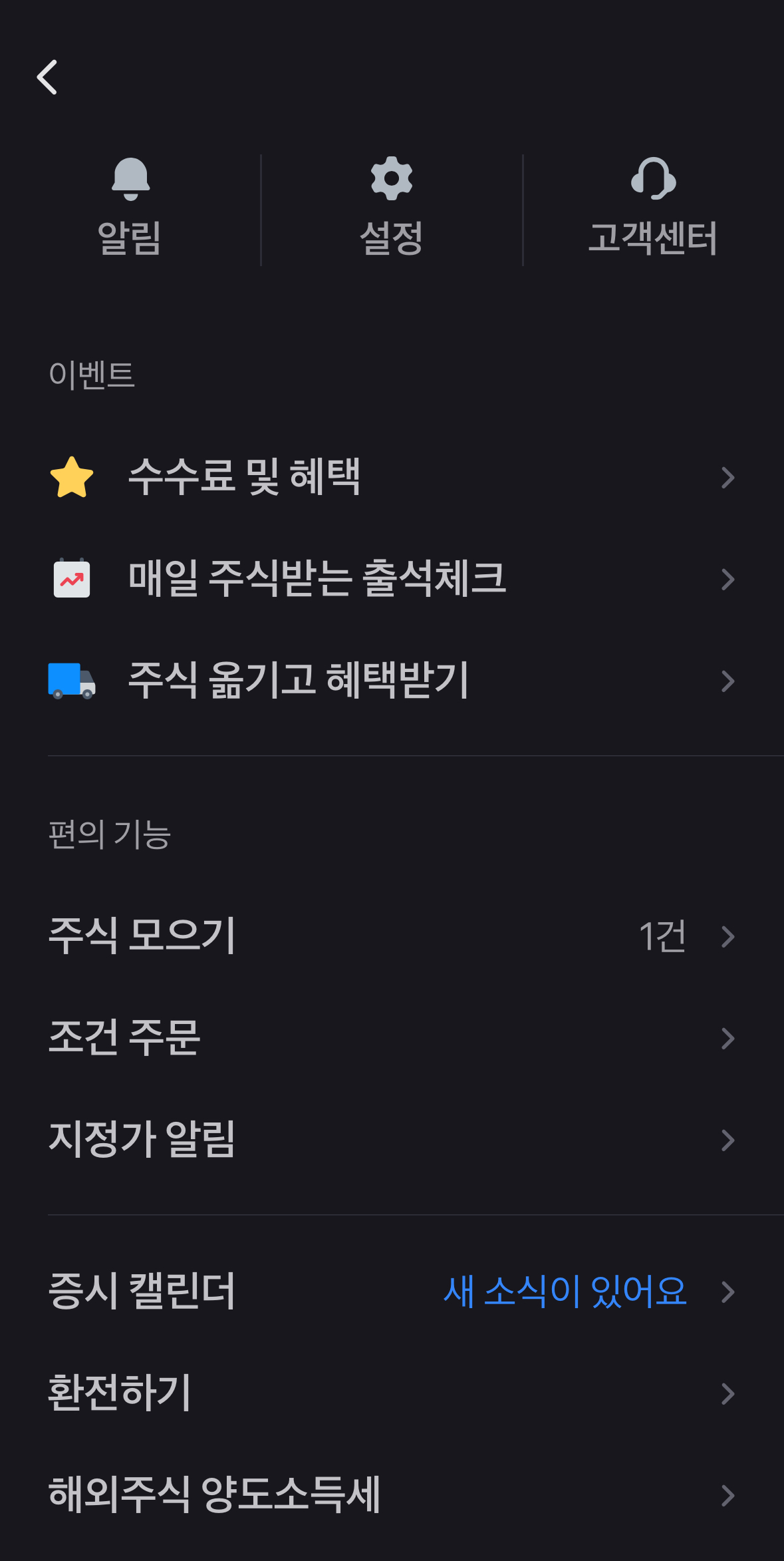 토스에서 주식을 선택한 첫 화면 오른쪽 최상단에 세줄 메뉴를 누르면 아래와 같은 화면이 나옵니다.