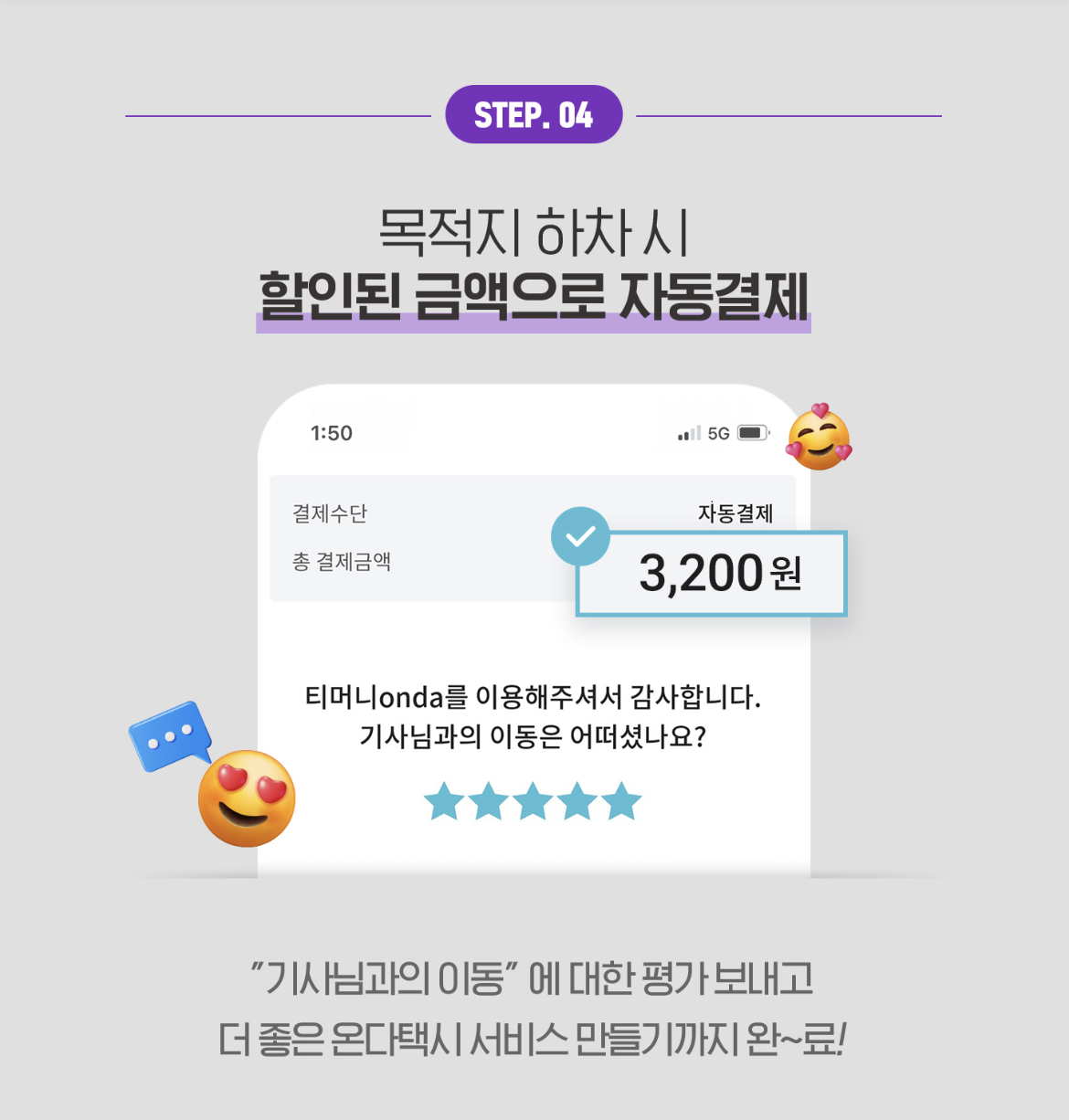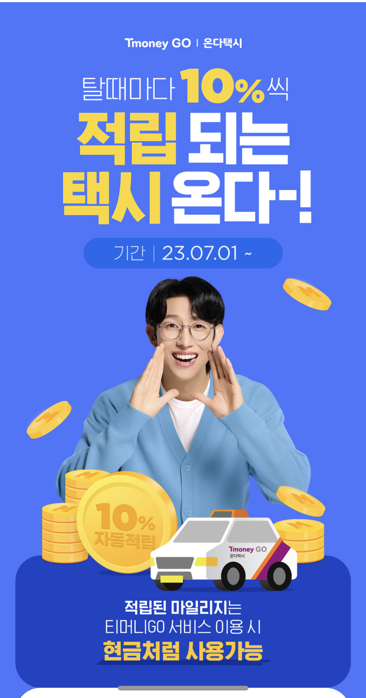 티머니GO'를 시작하면 여러 메뉴 중에 '온다택시'가 있습니다. 이 '온다택시'를 이용하면 이용 금액 할인 및 이용할 때마다 마일리지 적립(나중에 현금처럼 사용가능)혜택을 받을 수 있습니다.