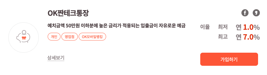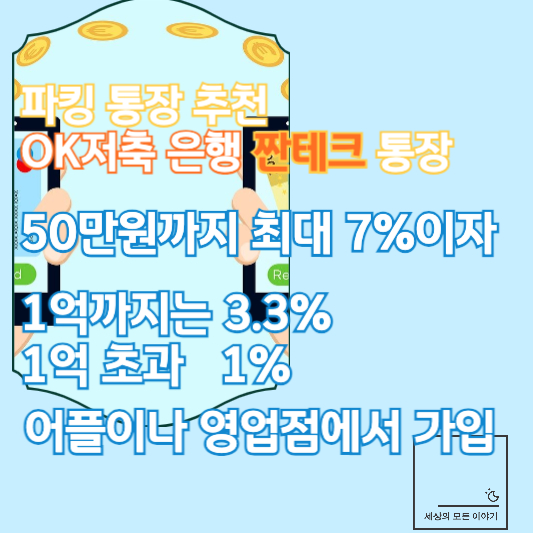 OK 저축은행 짠테크 통장은 OK 저축은행의 다른 상품을 이용하지 않는 분들을 대상으로 연 최대 7%의 이자를 제공합니다. 특이한 점은 가입 급액 제한은 없으나 50만원까지 연 7%, 1억 까지는 3.3%, 1억을 넘어서면 연 1%의 이자를 준다는 점입니다.