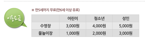 이용 요금은 여의도 잠원 뚝섬 광나루 등의 수영장은 만 6~12세 어린이 3000원, 만 13 ~18세 청소년 4000원이고 만 19세 이상 성인은 무려 5000원입니다. 다른 워터파크에서 구명조끼 대여료보다 싼 가격에 물놀이 즐기실 수 있습니다. 또 좀 더 어린 아이들이 즐길 수 있는 난지와 양화의 물놀이장은 어린이 1000원, 청소년 2000원, 성인 3000원으로 수영장 보다 더 저렴합니다.